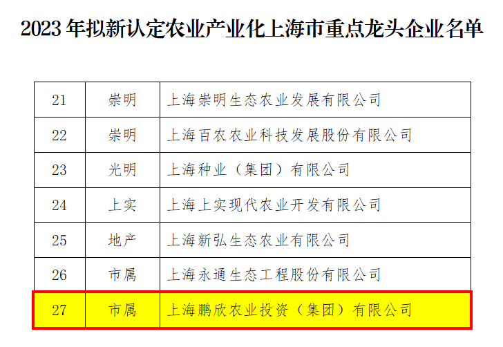 12月12日,上海市農業農村委員會公示了2023年農業產業化上海市重點龍頭企業名單,鵬欣農業投資集團被認定為農業產業化上海市重點龍頭企業。